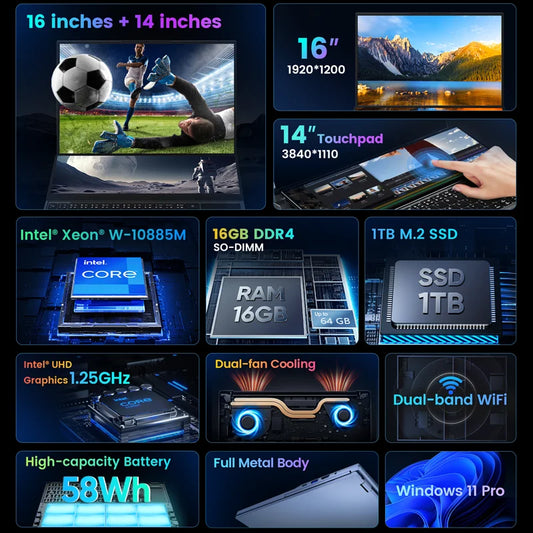 N-one Nbook Fly Laptops 16GB+1T Intel® Core™ i7-10850H Windows 11 Pro Double Screen