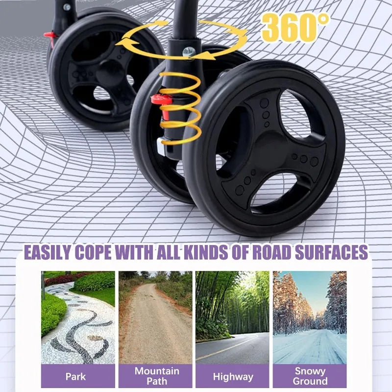 【Shock-absorbing wheels for a smooth ride】Our stroller is equipped with a specially designed shock-absorbing wheel system. The front wheel has a built-in shock-absorbing spring to ensure a smooth and comfortable ride for your baby. Whether you are driving on a bumpy road, the shock-absorbing function of the stroller provides optimal cushioning and stability, allowing your baby to sleep peacefully all the way without any bumps.