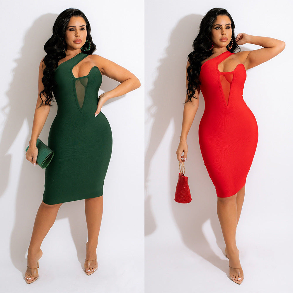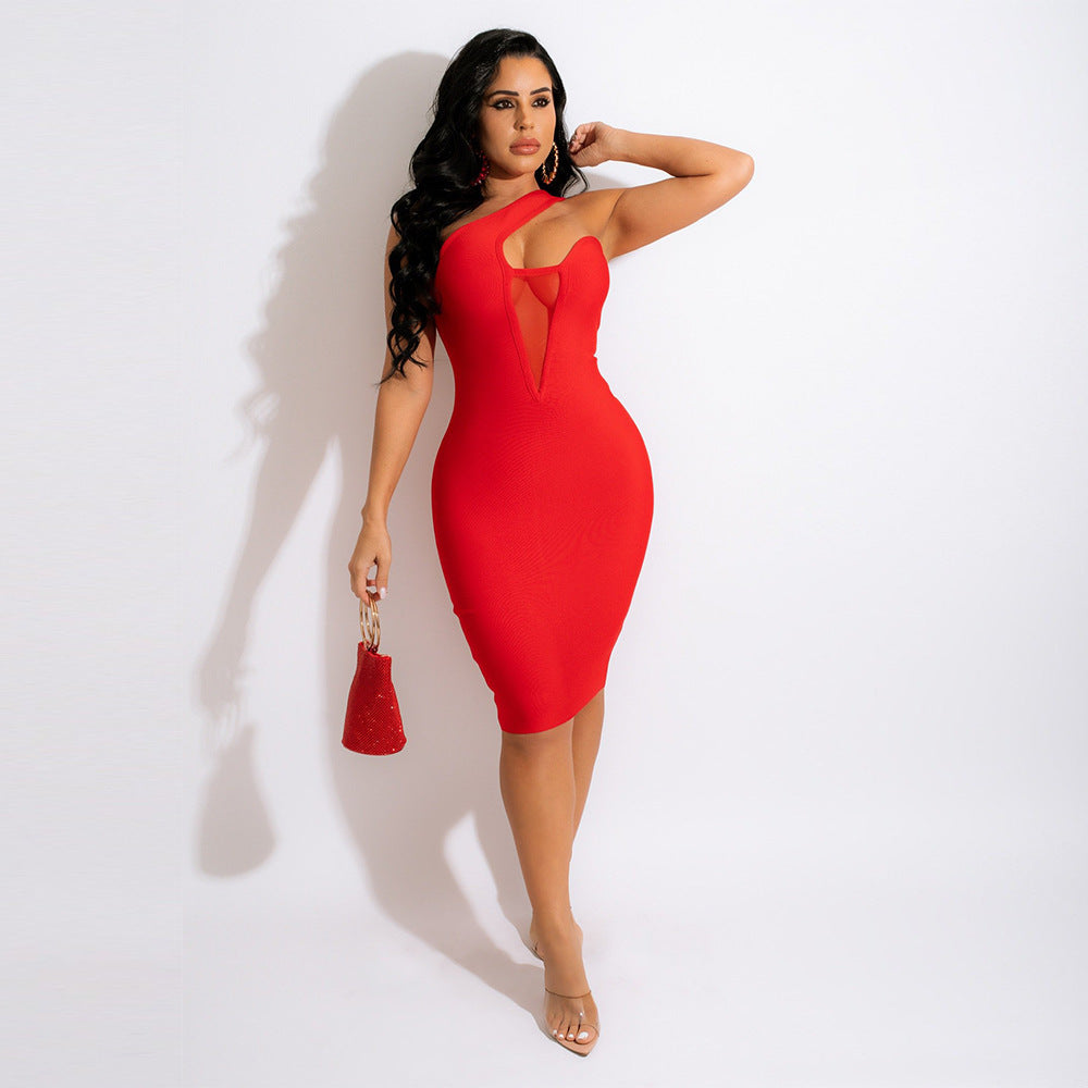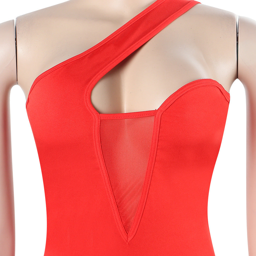 Popular elements: Irregular, one-shoulder see-through net dress