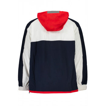 GIACCA SPORTIVA MANICHE LUNGHE CON CAPPUCCIO, 1 TASCONE ALTO CENTRALE, 2 TASCHE ESTERNE, 1/2 ZIP, VELCRO, ZIP LATERALE, DETTAGLI A CONTRASTO, STAMPA, RICAMO, APPLICAZIONE, LOGO, 95% NYLON RICICLATO