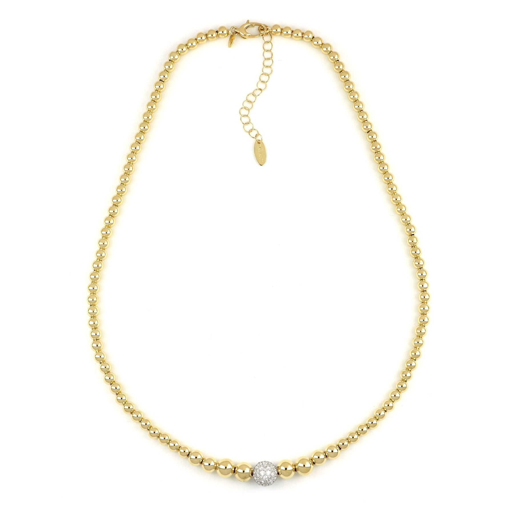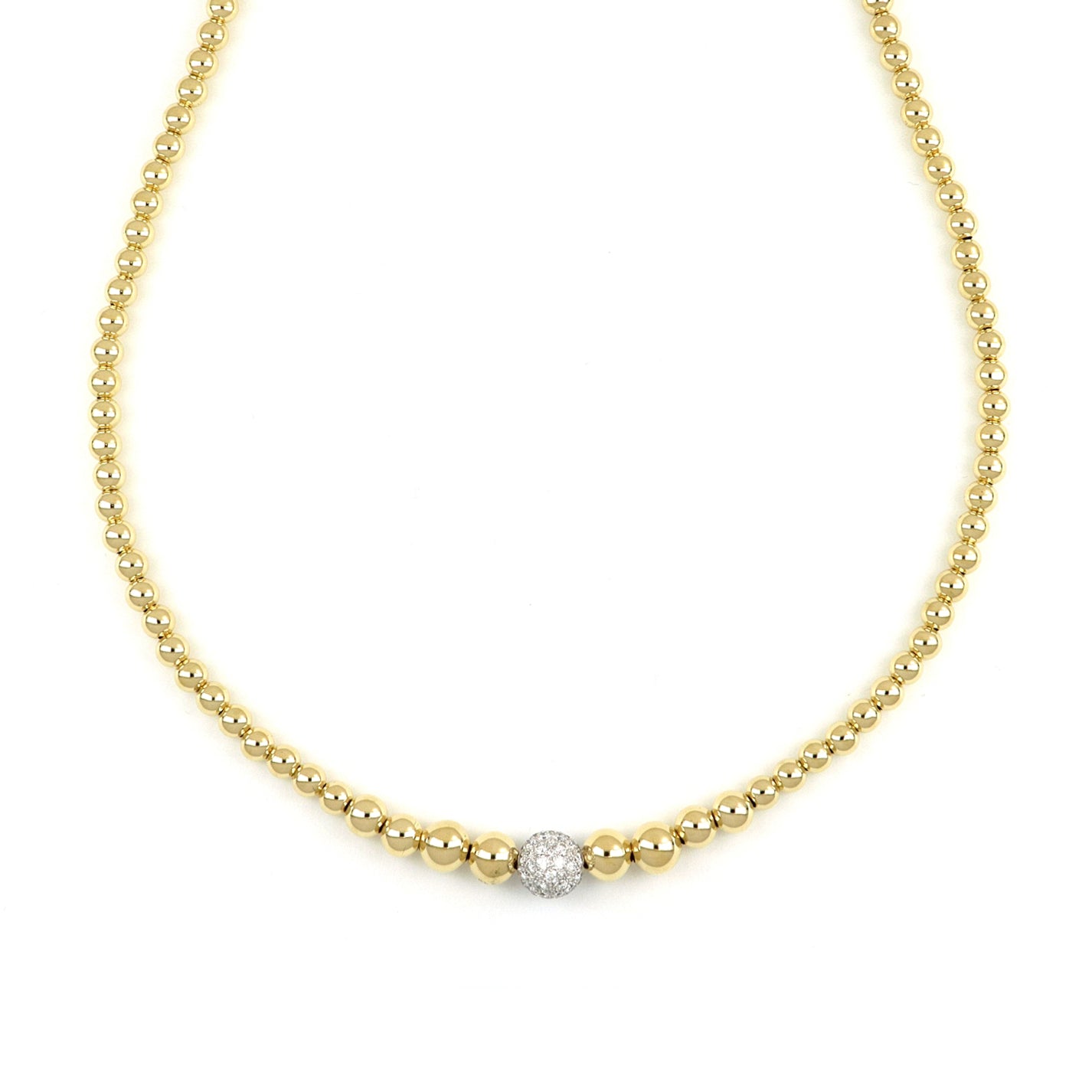 Il lusso e l’eleganza senza tempo di una collana degradé dalle linee essenziali, ma rivisitata in chiave moderna. Sfere in oro lucido a scalare si susseguono fino all'elemento centrale, ricoperto di diamanti scintillanti, che aggiunge un tocco glamour.